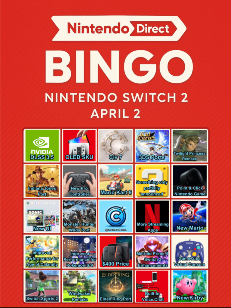 @criticalcoins The wait is almost over! The Nintendo Switch 2 Direct is a day away, and Im excited to share my prediction Bingo Board with you. Join the fun on April 2nd or share your predictions in the comments. #Nintendo #NintendoDirect #NintendoSwitch #nintendoswitch2 #Switch2 #gaming #gamestagram